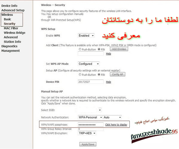 در صفحه اصلی تنظیمات گزینه ای با عنوان Wireless یا WiFi و یا WLAN وجو دارد. هر کدام از این گزینه ها را مشاهده کردید روی آن کلیک کنید و در بخش تنظیمات WiFi به قسمت Security رفته و از آنجا گزینه Password یا Preshared Key یا Passphrase را پیدا کنید و به دلخواه تغییر دهید.
